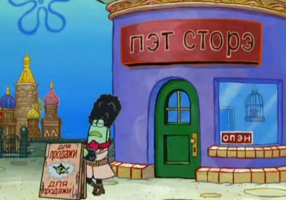 В фильме "Терминал" Том Хэнкс играет гражданина вымышленной русскоязычной страны Крокозии. У него даже документы есть. Правда, в них почему-то значится, что он из Гомеля (Беларусь). Но суть даже не в этом. Почему на латинице он Виктор Навроски, тогда как на родном языке он (видимо) татарка Гульнара Гулина? Вообще, я удивлён, что в фильме была допущена такая оплошность. Почему бы им не обратиться за консультацией к российскому актёру Валерию Николаеву, который также снимался в этом фильме? А теперь перейдем к мультсериалу "Губка Боб квадратные штаны", где также был показан некий русский район. Зоомагазин здесь называется "Пэт сторэ". Да, как и в случае с "Газолиной", авторы решили не переводить "Pet store", а просто написать то же самое, но заменив латинские буквы на русские. То же самое касается и надписи "Опэн" (Open - Открыто).