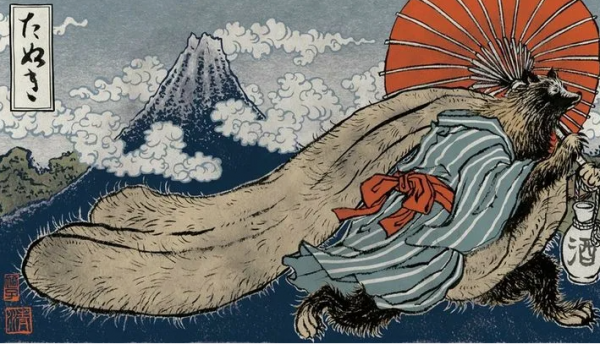 Тануки - известные оборотни (как и лисы) в японской мифологии. Они обожают превращаться в человека, посещать бар или бордель, а расплачиваться там осенними листиками, запудривая голову владельцу, что это золото. А чтобы плавать по рекам, они раздувают свои шары до размеров плавательного матраса. Если надо - сидят на них поудобнее, или накидывают, как плащ.