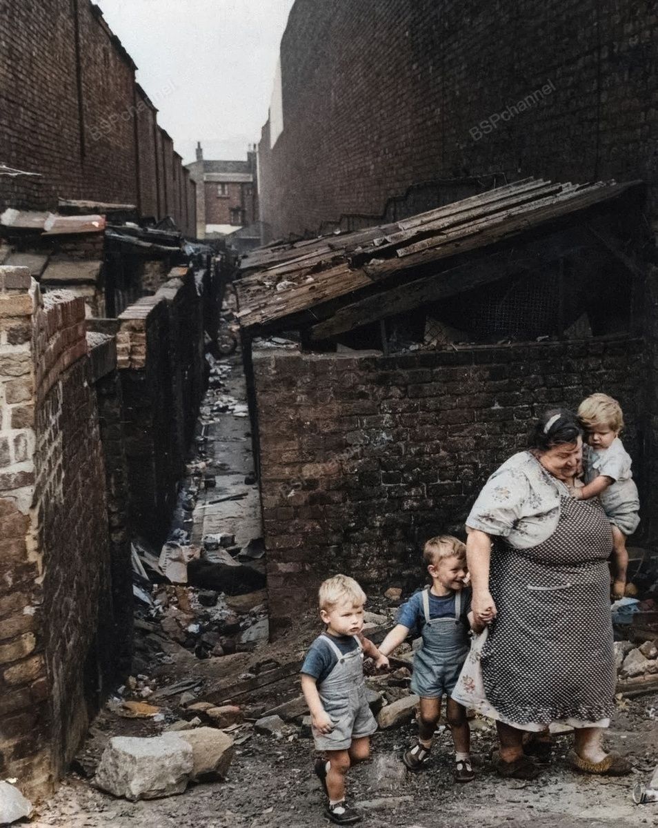 Мать и дети, пробирающиеся по глухому переулку. Трущобы Ливерпуля, 1962 год.