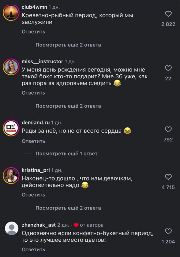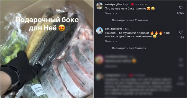 Рыбный магазин собрал набор с лаконичным и гениальным названием "Для нее". В обычной коробке лежат: банка красной икры, рыбка, креветки и полезная зеленушка.Пока девушки по всему миру ждут цветов, украшений и сладостей, в коментах под постом выяснилось, что настоящая взрослая женщина, оказывается, оценит совершенно иной жест. Коробку ароматной скумбрии холодного копчения, нежные кусочки сёмги слабой соли, хрустящие креветки и бутылочку чего-то крепкого для душевного разговора. Потому что цветы завянут через три дня, конфеты закончатся через вечер, а рыбка - это и вкусно, и полезно, и надолго.