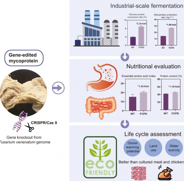 С помощью технологии CRISPR учёные аккуратно "отключили" два гена гриба. Первый отвечает за избыточный синтез хитина, из-за чего стенки клеток стали значительно тоньше и белок теперь усваивается почти полностью. Второй ген контролировал скорость роста и расход питательных веществ: после его деактивации гриб стал расти на 88 % быстрее, а потребление сахара сократилось на 44%.