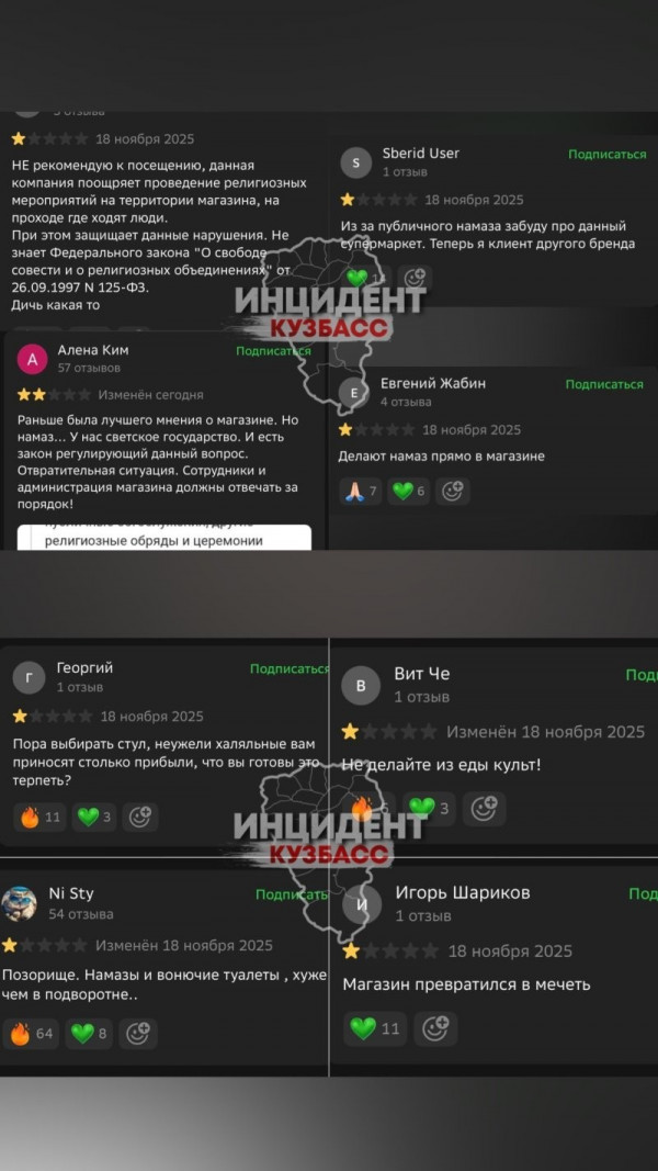 В Кемерове в магазине "Лента" двое иностранцев совершили намаз, что вызвало волну недовольства среди местных жителей. Видео с этим инцидентом появилось в Telegram-канале "Инцидент Кемерово". В ролике можно заметить также двух других мужчин, которые за спинами молящихся ели шаурму, сидя на корточках.Жители Кемерова активно выражали негодование на страницах магазина в социальных сетях. В отзывах люди жаловались, что иностранцы по каким-то своим соображениям превращают супермаркет в мечеть.