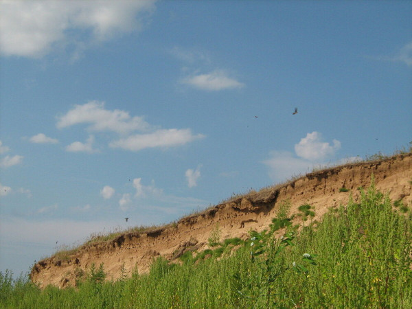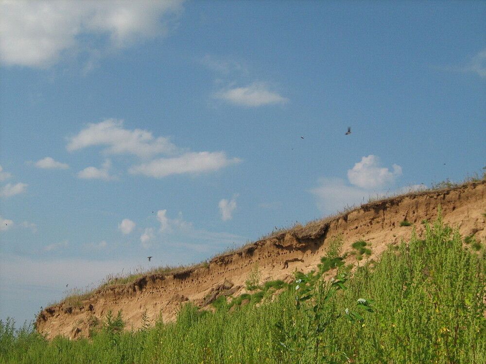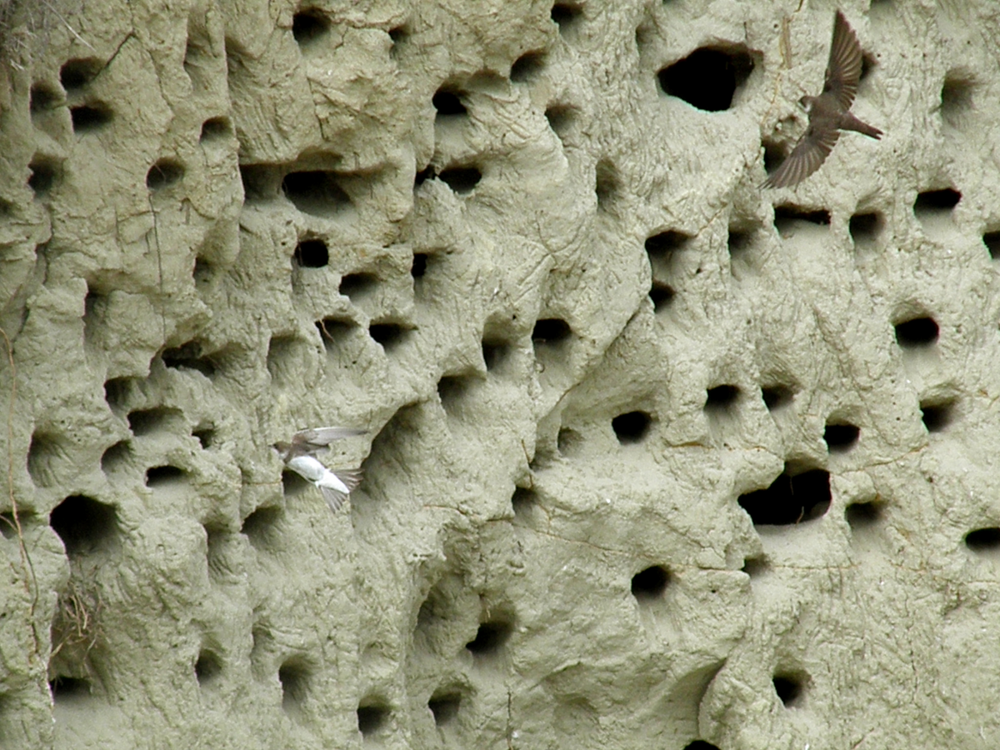 С помощью клюва и лапок ласточки роют норы до 1,2 м в глубь. Это, навскидку, в 10 раз больше самой береговушки - птичка достигает длины 12-14 см! И количество таких норок исчисляется сотнями, а то и тысячами! Склоны, испещренные трудолюбивыми пернатыми, в среднем растягиваются на 800-1000 метров. Это примерно как 8-9 хрущёвок, поставленных рядом друг с дружкой. А если объединить несколько колоний в одно "поселение", получится целый мегаполис длиной до 10 км!