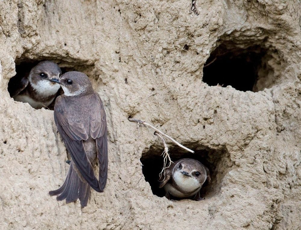 Во-вторых, дом береговушки - неприступная крепость для подавляющего большинства хищников. Птицы строят гнезда на крутых обрывах с мягким сыпучим грунтом. Даже самые ловкие охотники планеты: кошки, змеи, ласки и куницы - не способны игнорировать законы гравитации. До бункера ласточки им попросту не добраться!