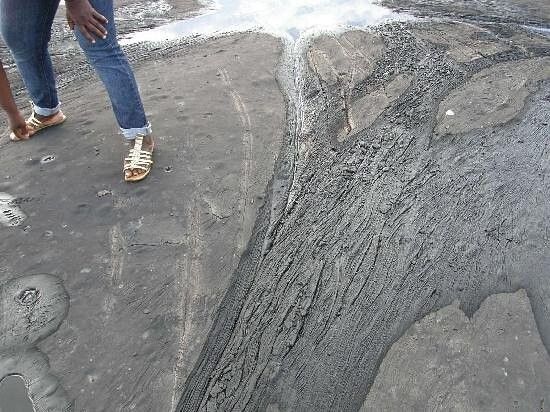 Это Озеро Пич-Лейк (Pitch Lake). Оно представляет собой природный резервуар из природного битума. По большей части оно почти твёрдое, что позволяет смелым путешественникам ступать по его странной поверхности.