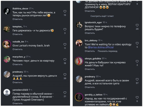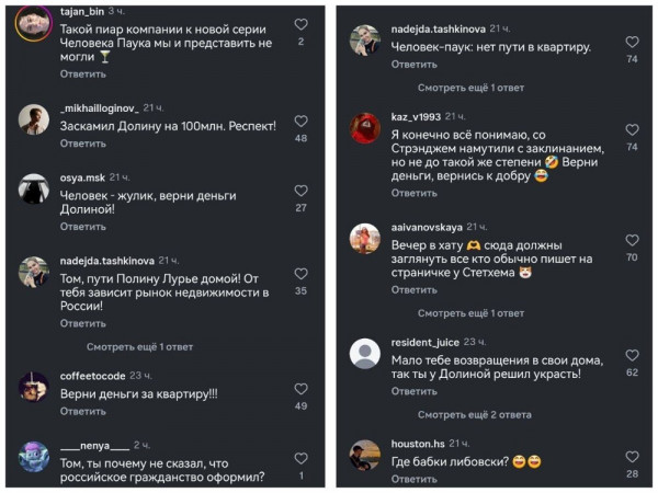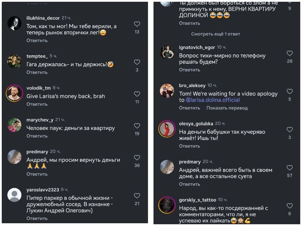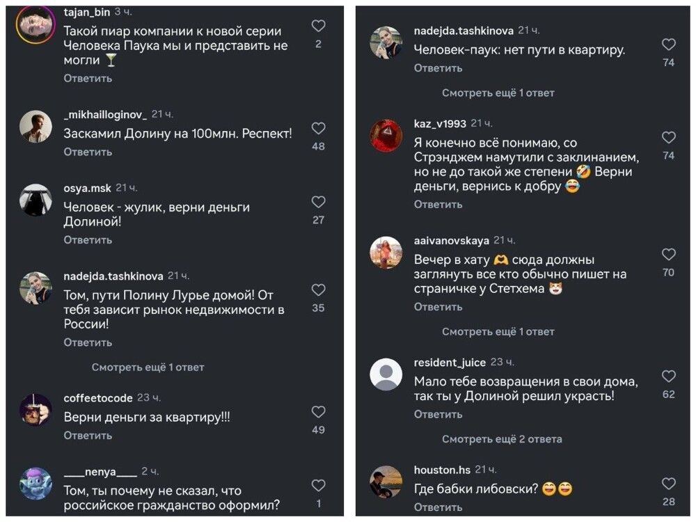 После того, как журналисты опубликовали поддельный документ, некоторые пользователи сети ринулись к Тому Холланду в Instagram* и устроили в комментариях вакханалию по примеру той, что иногда происходит у Джейсона Стэйтема. Россияне принялись в шутку требовать у человека-паука вернуть квартиру и сетовать на то, что не ожидали от любимого актёра, что он обрушит рынок вторичного жилья в России.