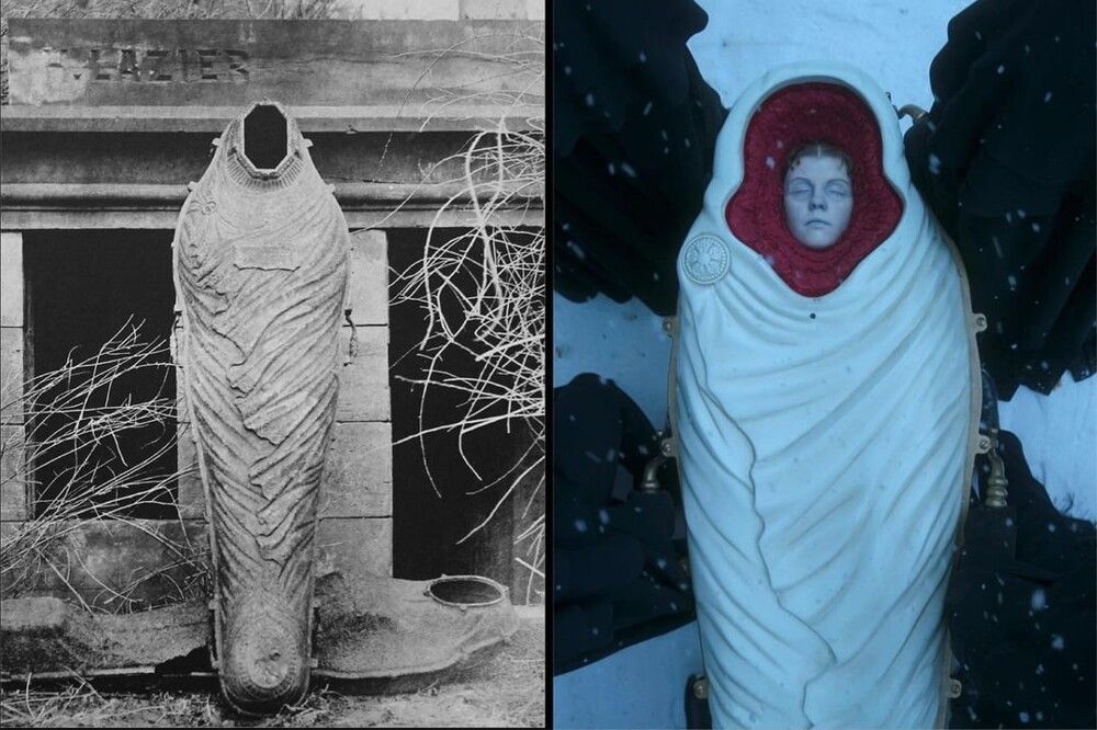 Гроб Фиска получил патент в 1848 году. Это воздухонепроницаемый гроб из кованого железа, характерный для похоронной паранойи викторианской эпохи. Его главными целями были защита от грунтовых вод, предотвращение распространения миазмов (считавшихся причиной болезней) и сохранение тела для будущего воскресения. Такие "безопасные" гробы, как показано во "Франкенштейне" Гильермо дель Торо (кадр справа), отражают глубокий страх XIX века перед преждевременным погребением и разложением.