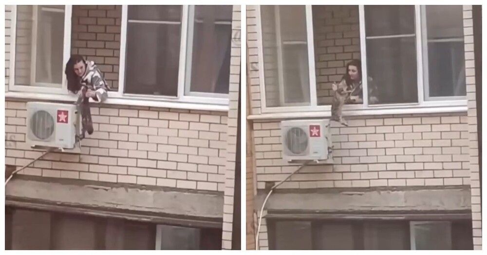 В Музыкальном микрорайоне Краснодара жительница вышла на балкон своей квартиры на третьем этаже и свесила кошку вниз, крепко держа и начала читать ей нотацию - видимо, в попытке наказать за какую-то провинность.