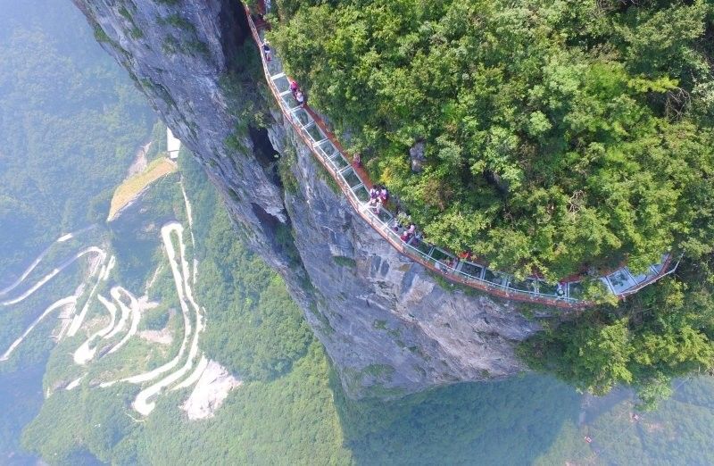 На высоте 1430 метров по отвесной скале горы Тяньмэнь ("Врата небес") вьётся стеклянная тропа длиной 60 метров и шириной менее метра. Под ногами у смельчаков - лишь прозрачное стекло, а внизу - пропасть. Это одна из самых экстремальных смотровых площадок мира, требующая недюжинной смелости. Чтобы сохранить хрупкое покрытие, посетители надевают бахилы. Из-за опасности работы по обслуживанию и мытью стекла здесь являются одними из самых высокооплачиваемых и рискованных.
