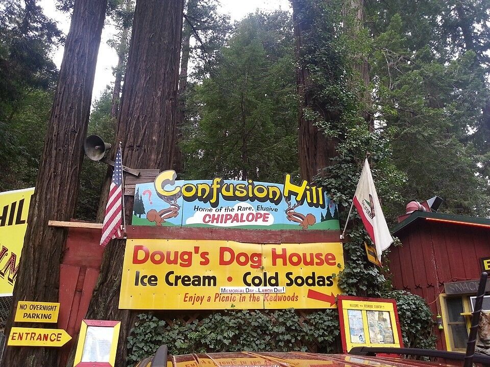 В калифорнийском городке Пирси находится аномальная зона "Холм заблуждения (путаницы)", построенная в 1949 году. Это искусственное сооружение, где гравитация будто бы перестаёт работать: вода течёт вверх, мяч катится на возвышение, а люди стоят под невозможным углом. Эффект создаётся благодаря хитроумным оптическим иллюзиям и наклону самого здания относительно горизонта. Место овеяно легендами о призраке инженера Дона Кэмпбелла, который, как говорят, после смерти продолжает шутить над посетителями.