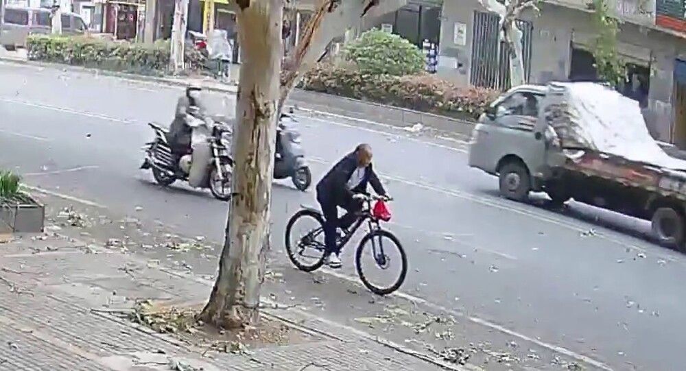 Камера наблюдения, установленная в китайском населенном пункте Чжучжоу, провинция Хунань, запечатлела момент падения части ствола дерева на велосипедиста. У пострадавшего мужчины диагностировали множественные переломы шейных и грудных позвонков и ребер, а также сотрясение головного мозга и субарахноидальное кровоизлияние