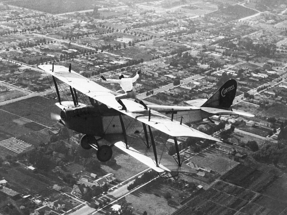 Американский лётчик-каскадёр летит со скоростью около 112 километров в час.
