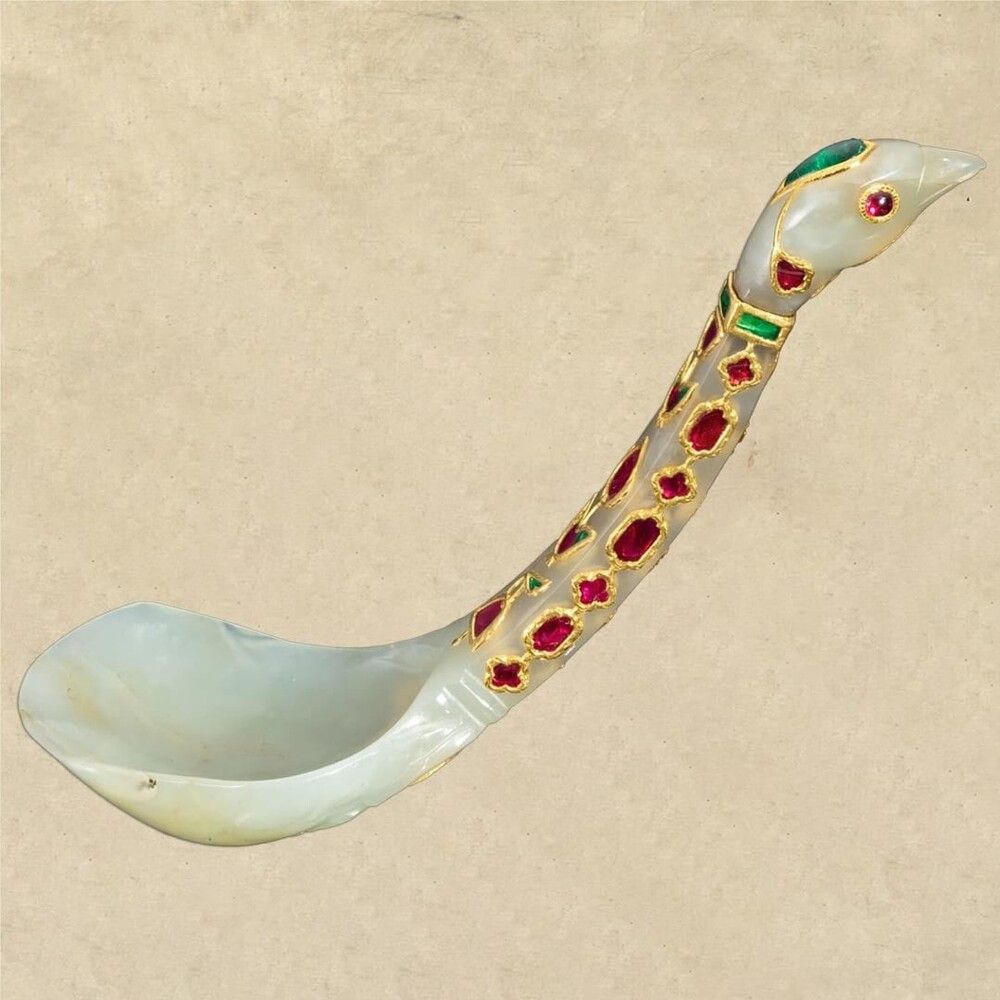 Вырезана из нефритового жадеита, инкрустирована золотом и украшена рубинами и изумрудами. Предоставлена в долгосрочную экспозицию Музею искусств округа Лос-Анджелес (LACMA) из коллекции аль-Сабах (Кувейт).