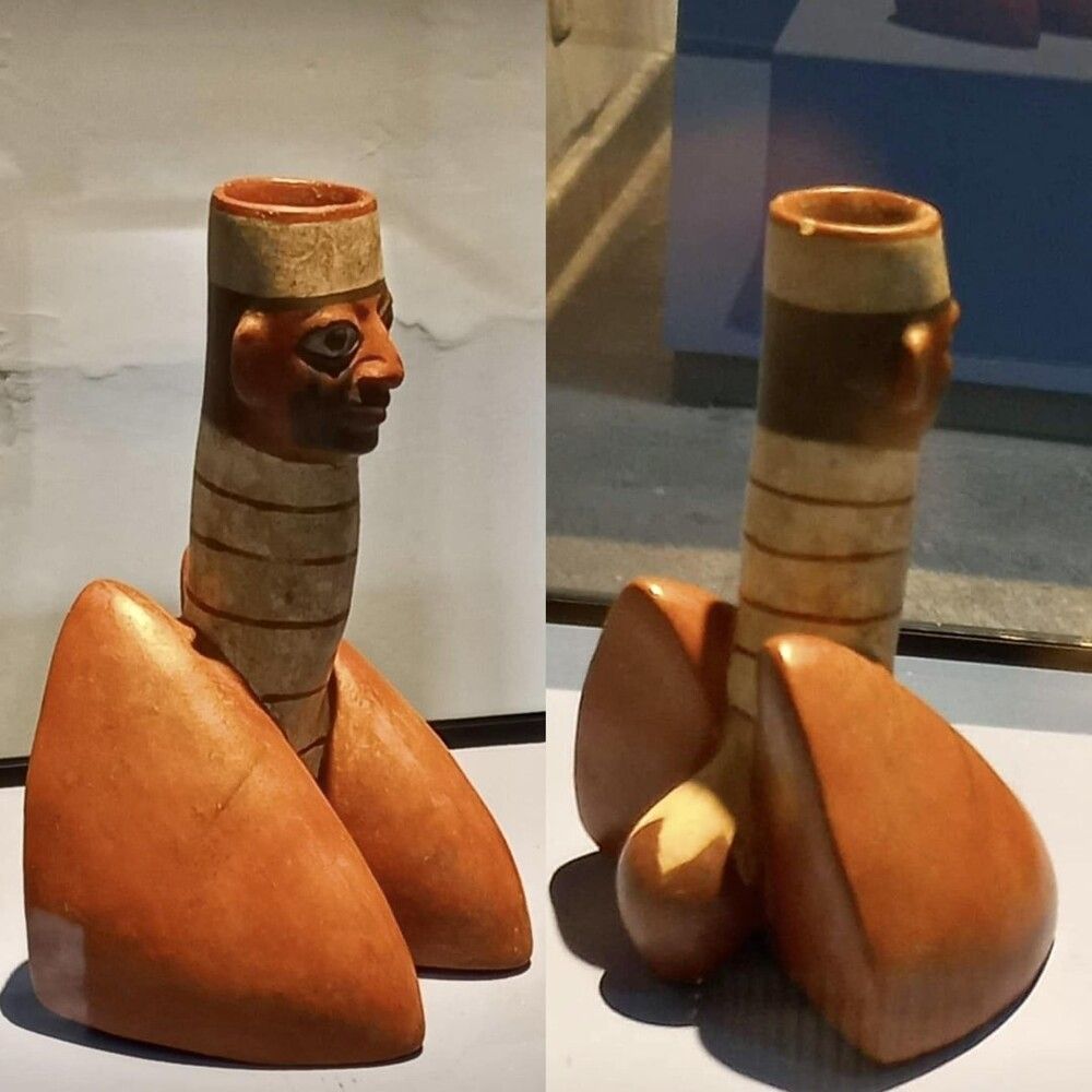 Изображает кардиореспираторную систему: трахею, соединённую с лёгкими и сердцем (расположенным на задней части сосуда). Культура Уари (VI-X вв. н.э.).