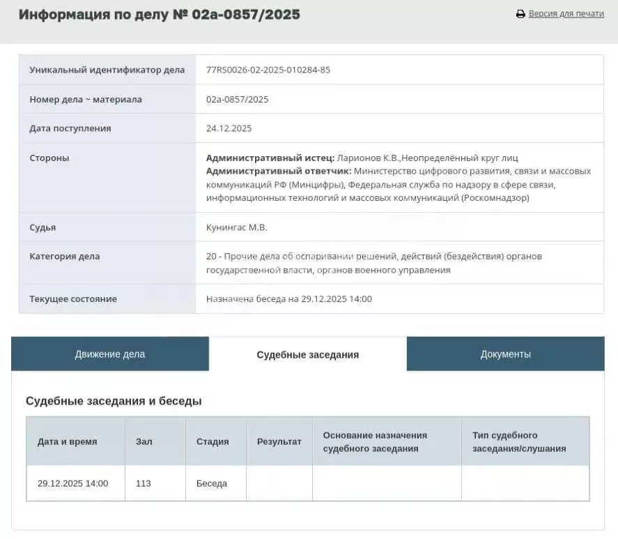 29 декабря Таганский суд Москвы отказал в коллективном иске против Роскомнадзора и Минцифры, требовавшем признать незаконными ограничения голосовых звонков в Telegram и WhatsApp* - сообщила пресс-служба судов общей юрисдикции столицы. Причина такого решения: истец Константин Ларионов, представлявший себя и 105 соистцов, не предоставил доказательств полномочий защищать права владельцев мессенджеров. Суд прекратил производство по делу № 02а-0857/2025, отклонив претензии о нарушении конституционных прав на свободу информации и тайну связи.Напомним, иск подали 24 декабря: пользователи ссылались на данные ЦБ о преобладании мошенничества через мобильные звонки и SMS, предлагая альтернативы вроде опциональной блокировки трафика. истец утверждал, что блокировки мессенджеров нарушают конституционные права россиян: свободу получения и распространения информации, тайну переписки и связи, а также принцип недопустимости произвольных ограничений прав человека. Кроме этого заявитель ссылался на тот факт, что Роскомнадзор не предоставил официальных доказательств эффективности предпринимаемых мер и не обосновал их пропорциональность.