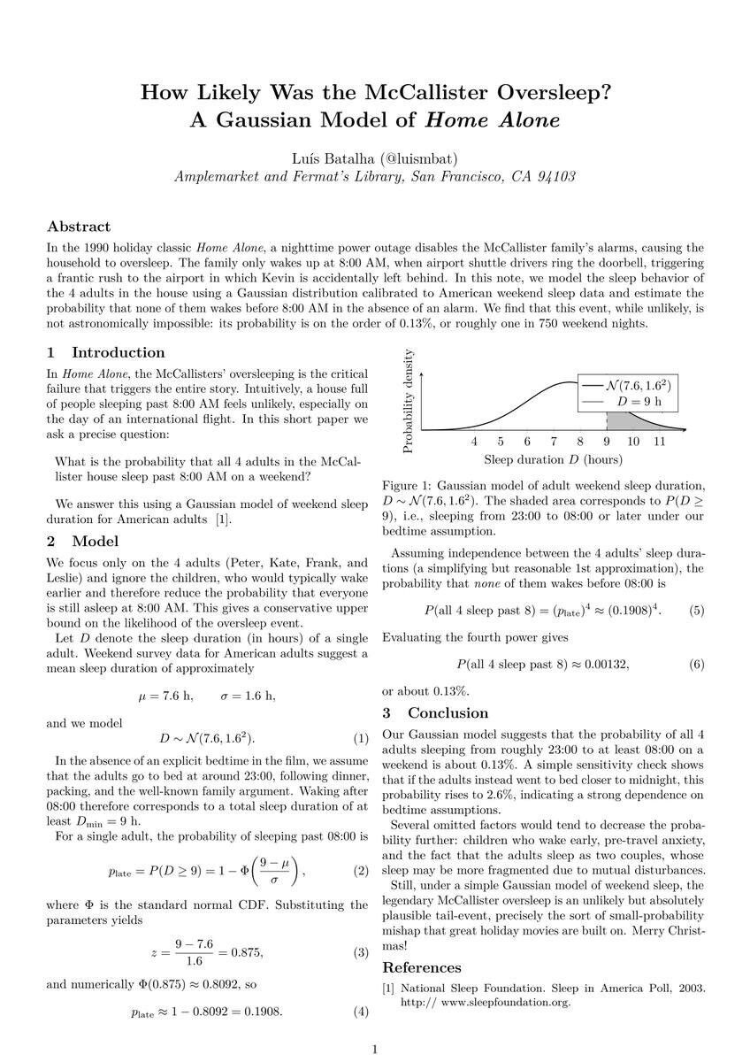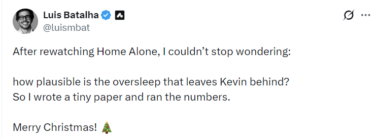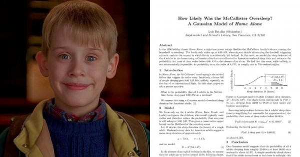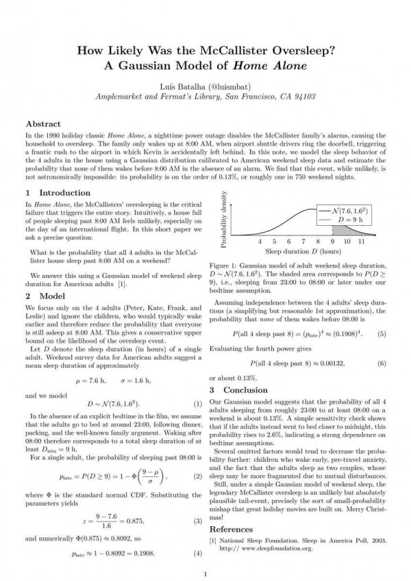 В классическом рождественском фильме 1990 года "Один дома" ночное отключение электричества выводит из строя будильники семьи Маккаллистеров, из-за чего все в доме просыпают самолёт. Семья просыпается только в 8:00 утра, когда водители такси до аэропорта звонят в дверь, провоцируя суматошную спешку, в ходе которой Кевина случайно забывают. В этой работе мы моделируем поведение во сне четырёх взрослых в доме, используя гауссово распределение, откалиброванное по американским данным о сне в выходные дни, и оцениваем вероятность того, что ни один из них не проснется до 8:00 утра при отсутствии будильника. Мы выясняем, что это событие, хотя и маловероятно, не является астрономически невозможным: его вероятность составляет порядка 0,13%, или примерно одна ночь из 750 в выходные.Итак, Баталья рассчитал, что завязка фильма "Один дома" может произойти примерно один раз на 750 ночей в выходные. Если учесть, что герои легли спать после полуночи, то шанс вырастает до 2,6%. Проще говоря, Кевину сильно "повезло".Пользователи оценили научный юмор и один из коллег физика даже отрецензировал его работу:Я внимательно рассмотрел данную рукопись и пришёл к выводу, что её не следует принимать в текущем виде, ни в какой правдоподобной будущей редакции, да и вообще её не следовало писать. Основная проблема в том, что все предположения авторов НЕВЕРНЫ, что особенно тревожно, поскольку они явно их излагают, что только облегчает мне задачу возмутиться ими.Пожалуйста, воспроизведите условия в доме МакКаллистеров в контролируемом эксперименте, включая отключение электричества, соответствующее тому периоду, четырёх взрослых, нескольких детей, тревожность перед вылетом и звуковой стимул дверного звонка в 08:00, повторённые на протяжении N ≥ 10 000 праздничных выходных, с контролем погодных условий.В качестве альтернативы, выведите точное распределение из первых принципов, используя механистическую модель рождественской логистики и нарративной энтропии.