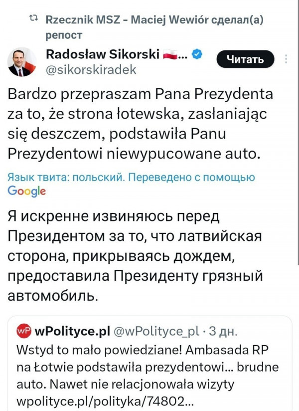 В МИД Польши подчеркнули, что ответственность за транспортировку делегации несет принимающая сторона, а не польское посольство, и признали ситуацию "крайне неприятной" с точки зрения протокола.Представитель латвийской стороны объяснил инцидент сильным дождем в день прибытия и тем, что на территории аэропорта нет собственной автомойки, где можно было бы оперативно привести автомобиль в порядок.