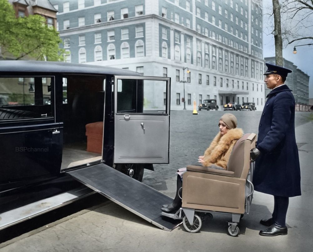 Женщина в инвалидном кресле заезжает по пандусу в ожидающий автомобиль. Нью-Йорк, 1933 год.