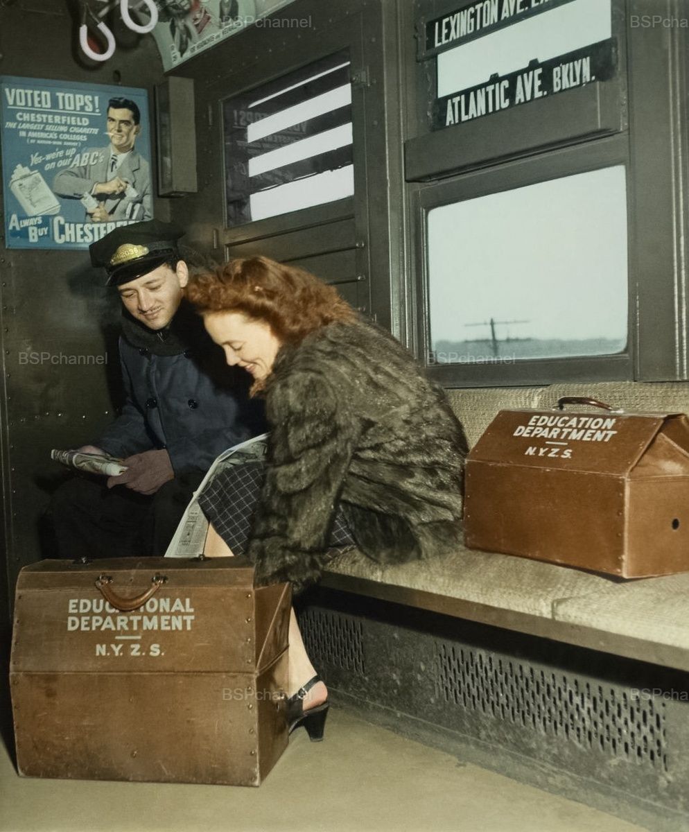 Учительница демонстрирует необычное содержимое своей сумки кондуктору метро в Нью-Йорке, 1940-е.