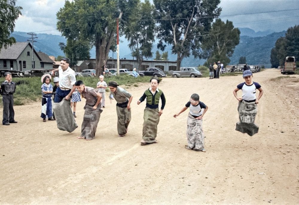 Бег в мешках среди мальчиков, празднование Дня труда, Риджуэй, Колорадо, 1940 год.