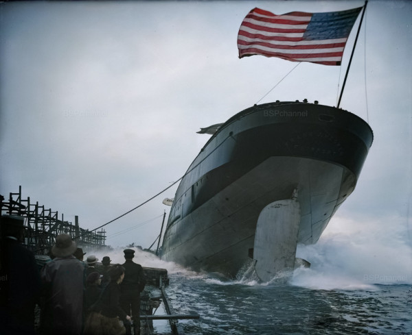 Спуск на воду парохода "Frank J. Hecker" с верфи от пристани озера Сент-Клэр. США, 1905 год.