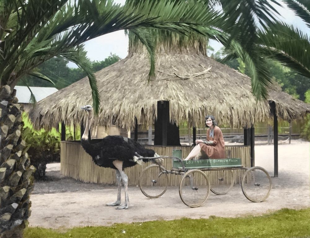 В 1886 году Эдвард Коустон привёз страусов в Калифорнию с вполне прагматичной целью - продавать их перья как модные украшения для дамских шляп. Однако бизнес оказался не таким прибыльным, как ожидалось, и тогда Коустон нашёл куда более оригинальное применение своим подопечным: он начал возить туристов на повозках, запряжённых страусами. Идея оказалась блестящей. Ферма быстро стала популярной достопримечательностью, на которую стремились посмотреть все, кто хотел увидеть этих экзотических птиц вживую. Настолько востребованной, что железнодорожная компания Pacific Electric даже построила специальную станцию прямо у ворот фермы, чтобы туристам было удобнее добираться. Посетители могли не только покататься верхом на страусах и прокатиться в экзотической упряжке, но и унести с собой на память страусиные перья. Ферма просуществовала до 1935 года, но сейчас там работает музей.