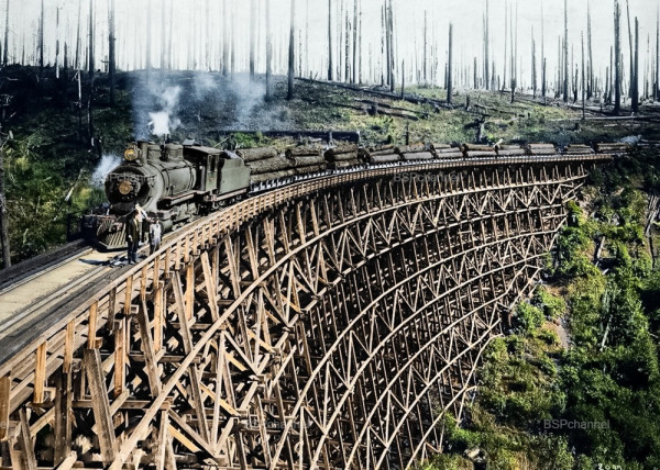 Лесовоз на железнодорожном мосту. США, 1918 год.