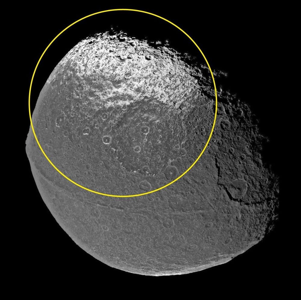 Ледяные полярные шапкиНа полюсах Япета зонд "Кассини" обнаружил ярко-белые области, представляющие собой результат уникального процесса перераспределения водяного льда. Под влиянием солнечного света темная поверхность нагревается до 130 Кельвинов (примерно -143 градуса Цельсия), заставляя лед сублимировать, а затем выпадать осадками на более холодных полюсах.