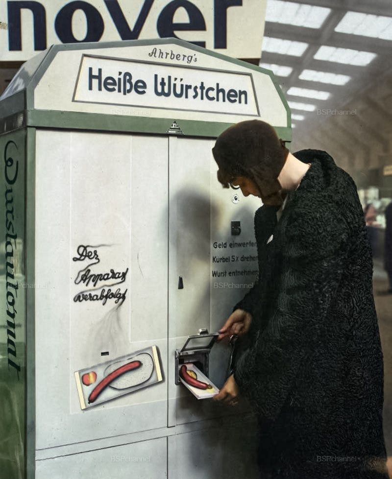 Девушка у автомата по продаже горячих сосисок. Германия, 1931 год.