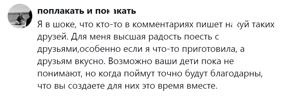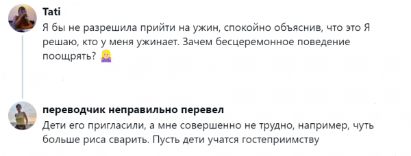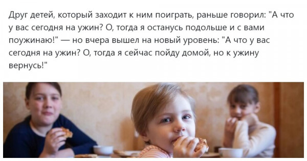 Для многих родителей нормально, когда их сын или дочь иногда приглашает домой одноклассника. Дети играют, учат уроки, социализируется. А взрослые больше узнают об окружении любимого чада и, соответственно, меньше беспокоятся, что наследник свяжется не с той компанией. Но вопрос перекуса в современных реалиях стоит острее, что ли. Ведь многие семьи не готовят дома, а заказывают готовую еду по количеству едоков. К тому же у маленького гостя может быть аллергия или непереносимость каких-то компонентов даже готовой еды. Пользователи задались целью понять - стоит ли поощрять такие посещения "всё включено", и где находится та тонкая грань между "налить ребёнку тарелку супу" и "гость окончательно и бесповоротно сел на шею".