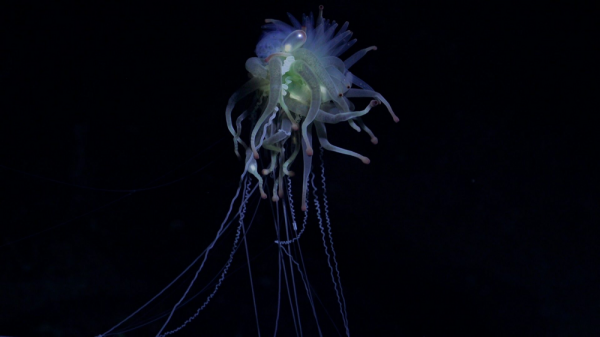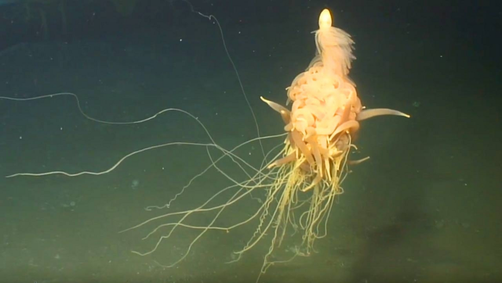 Чуть ниже расположены несколько нектофор. Выглядят они как толстые макаронины и отвечают за движение всей колонии. Нектофоры сокращаются по принципу зонтика - открываются и закрываются, захватывая и выбрасывая воду, чем и обеспечивается движение. Конечно, на такой тяге сильно не разгонишься, поэтому батифизы не могут просто взять и уплыть куда-то. Всю жизнь они проводят в управляемом дрейфе по Атлантическому и Тихому океанам. При этом встречаются колонии только на большой глубине, от 1000 до 4000 метров. Там темно, холодно, да и плыть-то особо некуда