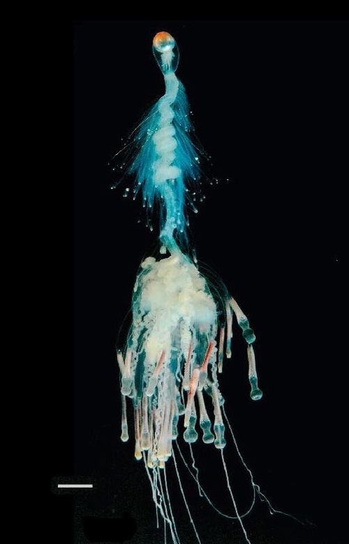 Батифиза шишковатая - представитель отряда сифонофор. Это дальние родственники медуз. Только вот в отличие от них, и от почти всех других современных животных в целом, батифиза предпочитает местоимение мы/нас. Потому что это одно из самых необычных подводных существ - единый организм, но созданный из нескольких отдельных клонов, или зооидов. Этакая колония-общага. Клоны не могут жить по-отдельности, вне колонии, но сама колония вполне способна создать ещё кучу клонов на замену другим. Звучит сложно, но сейчас мы разберёмся.