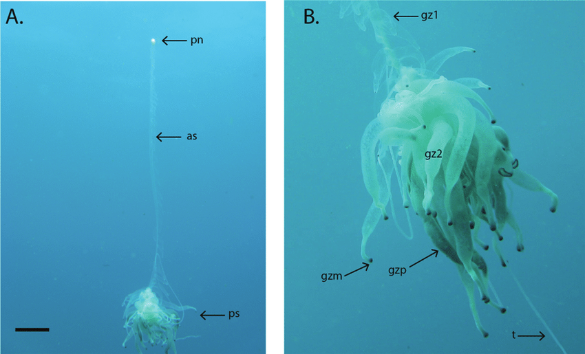 Как и всё живое, батифиза начинает свой путь с одной-единственной оплодотворённой клетки, зиготы. Через недельку-другую зигота развивается в свободно плавающую в толще воды личинку. Какое-то время она дрейфует по течению и набирается сил, после чего начинается биологическая магия. Личинка создаёт точную копию себя, а затем вторую, третью, четвёртую... Да, некоторые кишечнополостные, например, гидры, которых изучают в школе, тоже умеют размножаться созданием собственных клонов. Но в случае с батифизой всё иначе. Клоны гидры отпочковываются и отваливаются, начиная собственную независимую жизнь. А у макаронного монстра все клоны-зооиды остаются жить вместе. И более того, сразу после рождения каждый клон получает собственную "профессию".