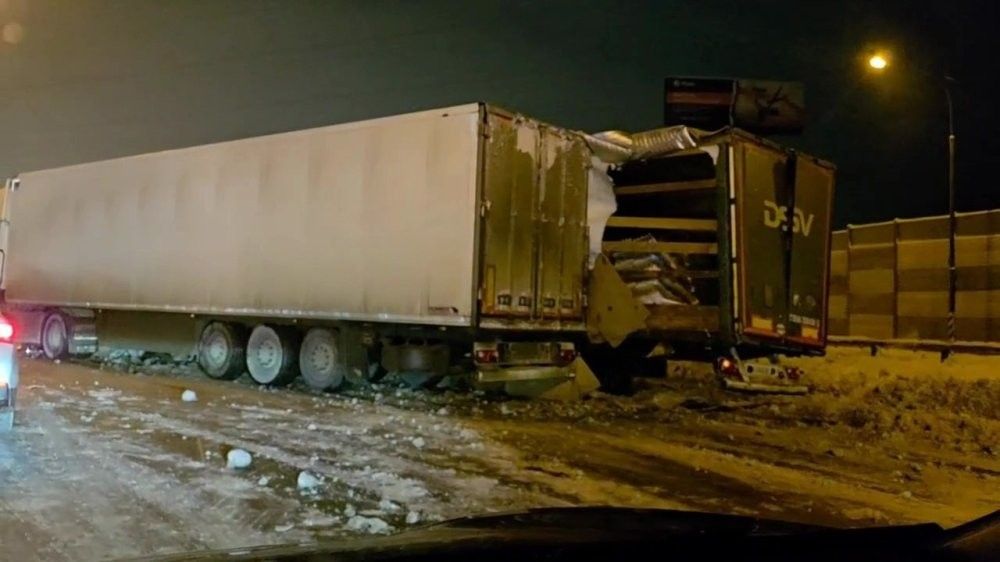 На МКАД возле пересечения с Бесединским шоссе большегрузный автомобиль, двигавшийся по правой полосе, наехал на забытую дорожниками кучу снега. Грузовик занесло, после чего в него врезалась другая двигавшаяся следом фура.