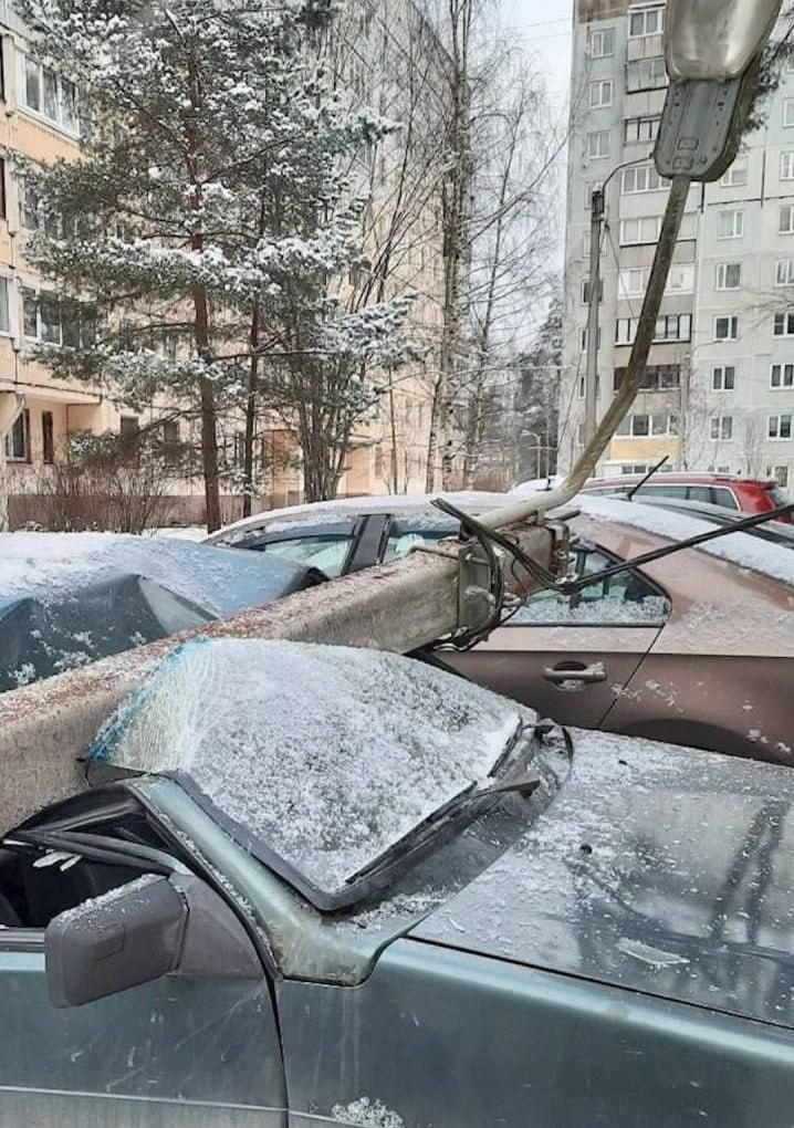 Водитель самосвала со снегом не заметил фонарный столб и снес его в городе Сертолово Ленинградской области. В результате столб упал прямо на припаркованный автомобиль.
