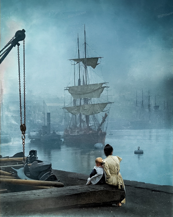 Молодая женщина с малышкой в Лондоне наблюдают за парусником, плывущим по Темзе, 1880-е.