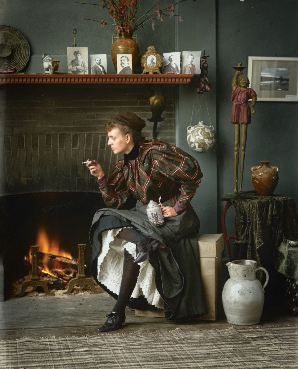 Автопортрет в студии. Фрэнсис Бенджамин Джонстон перед камином с сигаретой и кружкой пива. Вашингтон, округ Колумбия, 1896 год.
