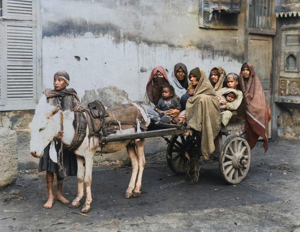 Осёл и повозка с пассажирами. Каир, Египет, около 1890 года.