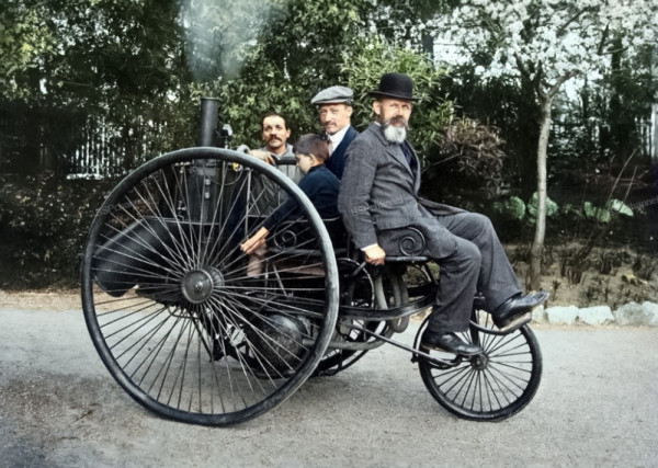 Швейцарский инженер Рене Тюри на своем трехколесном паровом велосипеде, около 1880 года.