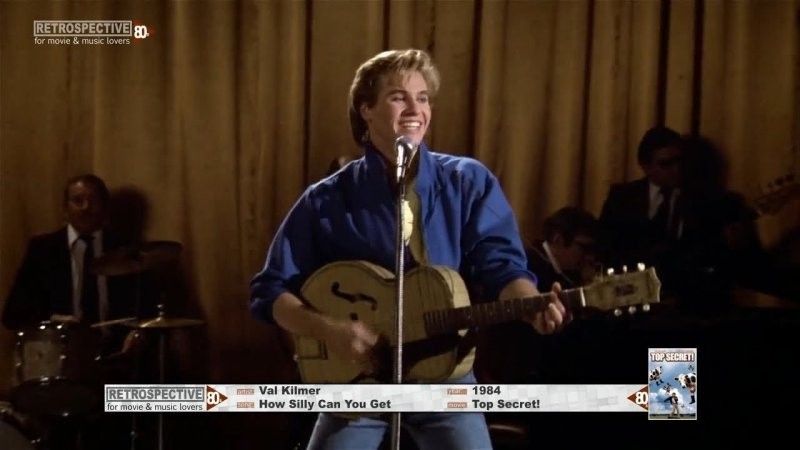 В фильме "Совершенно секретно" 1984 года Вэл Килмер сыграл певца Ника Риверса, втянутого в шпионский заговор в Восточной Германии. Фильм снимало трио создателей "Аэроплана" - Джерри Цукер, Джим Абрахамс и Дэвид Цукер. Они уговорили Килмера научиться играть на гитаре за четыре месяца, а в первый день съёмок заявили, что ему нужно лишь изображать игру. Настоящий талант и навык не требовался.