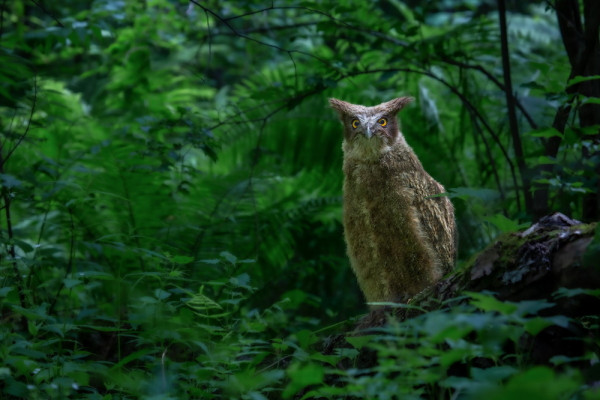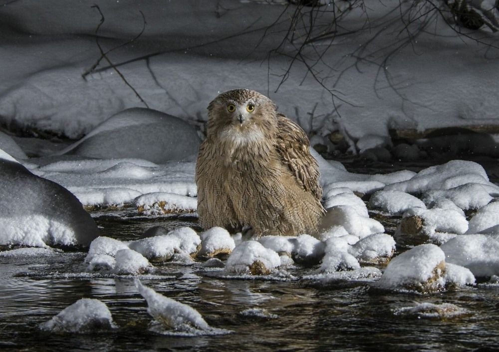 Эволюция убрала бесшумность полёта - она просто не нужна рыболову! Знакомьтесь: рыбный филин (Ketupa blakistoni) - самая крупная сова планеты и один из самых редких пернатых хищников России.Размах крыльев до 190 сантиметров - почти два метра! Вес самок достигает 4,5 килограммов. Для сравнения: обычная сова весит 500-600 граммов. На голове мохнатые перьевые "уши", которые торчат в стороны, словно растрёпанные антенны. Глаза ярко-жёлтые, пронзительные.