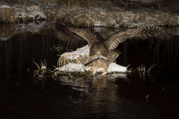 У пернатого хищника есть два основных способа охоты: Способ первый: пикирующий удар. Птица сидит на нависшей ветке и терпеливо высматривает добычу. Увидел рыбу - молниеносно пикирует, выхватывает её когтями из воды и взмывает обратно. При этом филин НИКОГДА не погружается в воду полностью - только лапы! Способ второй: бродячий рыбак. Филин заходит в воду по брюхо и, расставив полураскрытые крылья для баланса, медленно бродит по перекатам, нащупывая лапами рыб и раков на дне. Зрелище сюрреалистическое: огромная сова, размером с индюка, бредёт по мелководью, как цапля, и шарит лапами под камнями. После таких заплывов зимой перья могут обмерзнуть. И тогда филин не может взлететь. Поэтому этот способ харакерен для тёплых дней.