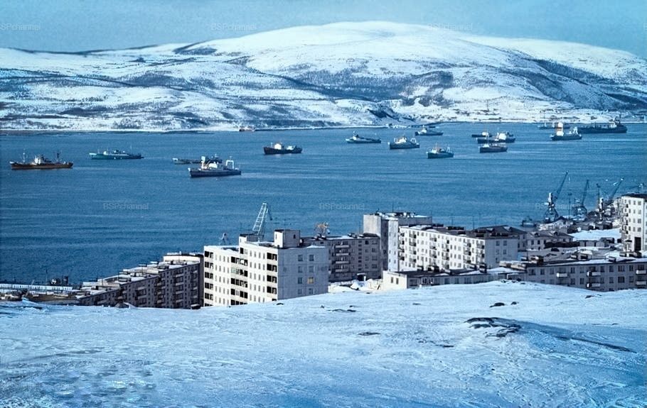 Рыболовецкие суда на рейде в Кольском заливе. Мурманск, 1977 год.