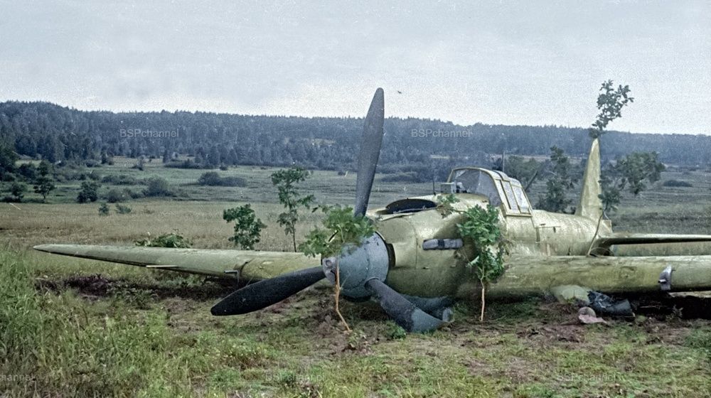 Советский штурмовик Ил-2, совершивший вынужденную посадку у лесополосы, 1941-1945 год.