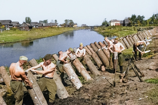 Бойцы Волховского фронта во время строительства противотанковых оборонительных сооружений на Лужском рубеже. Ленинградская область,1941 год.