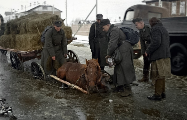 Немецкие пленные солдаты, захваченные южнее Воронежа под конвоем красноармейцев, 1942 год.