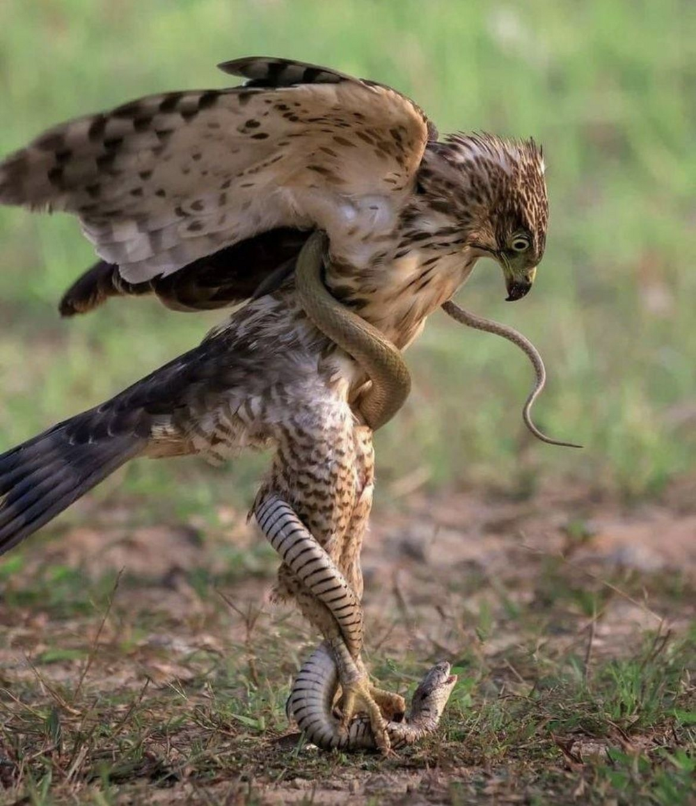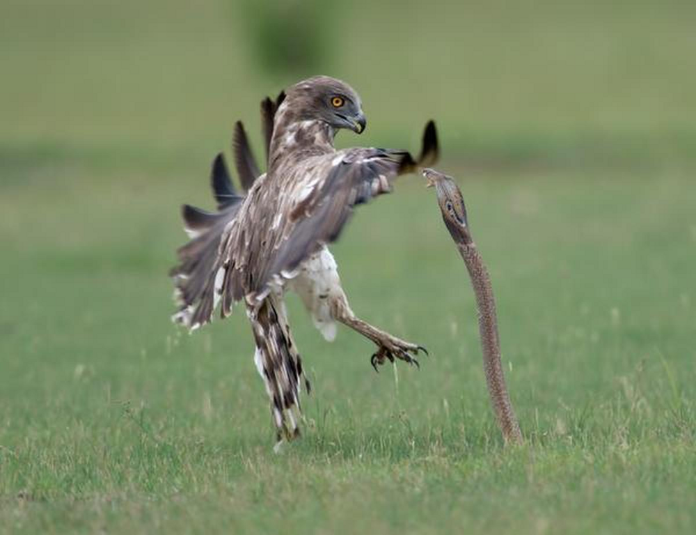 И в этой стезе змееяд просто чудо как хорош. Он способен охотиться на любых змей, за исключением самых крупных: от безобидного европейского ужа до опасной индийской королевской кобры и безумно ядовитой африканской чёрной мамбы. Ведь тактика его охоты крайне проста, эффективна и, одновременно с этим, смертельно опасна для самой птицы.