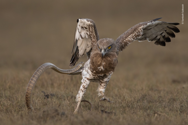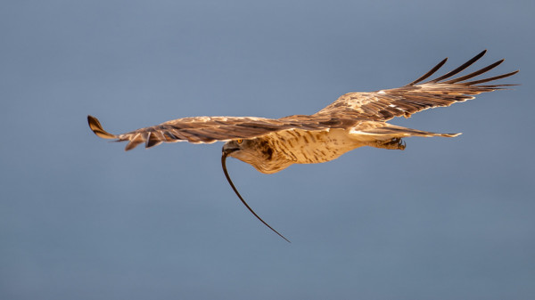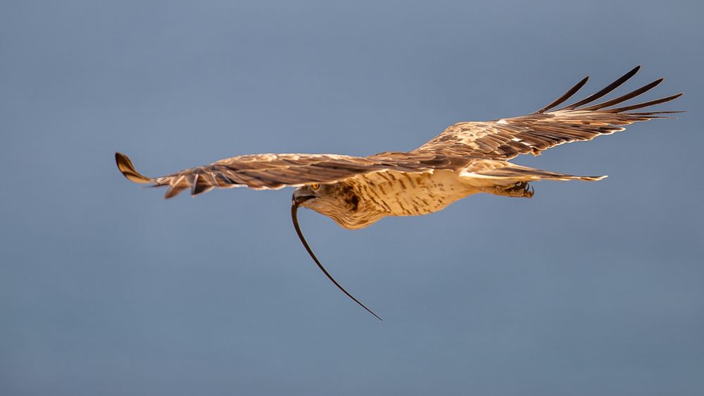 На бумаге всё выглядит легко. Сначала оголодавшая птица парит под облаками и высматривает добычу с помощью своего орлиного зрения. Заметив жертву, она камнем падает вниз, разгоняясь при этом до доброй сотни километров в час и, практически у самой добычи, резко сбрасывает скорость ударами крыльев по воздуху. Одновременно с этим птица выбрасывает вперёд когтистые лапы, которые буквально приколачивают к земле голову и шею змеи. Один-два быстрых удара клювом - и вот добыча уже не способна сопротивляться.