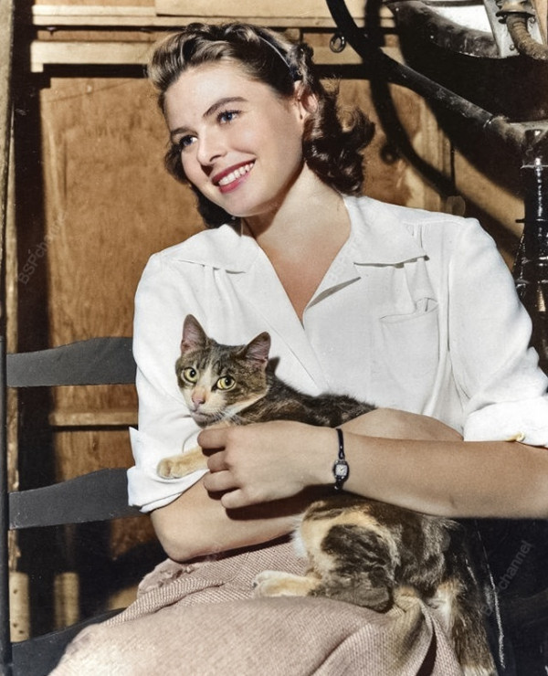 Шведская актриса Ингрид Бергман держит свою кошку, 1940-е годы.