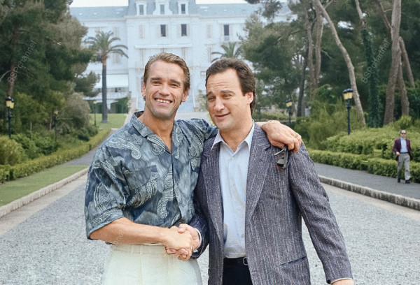 Арнольд Шварценеггер и Джеймс Белуши во время Каннского кинофестиваля, 19 мая 1988 года.